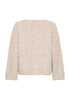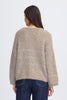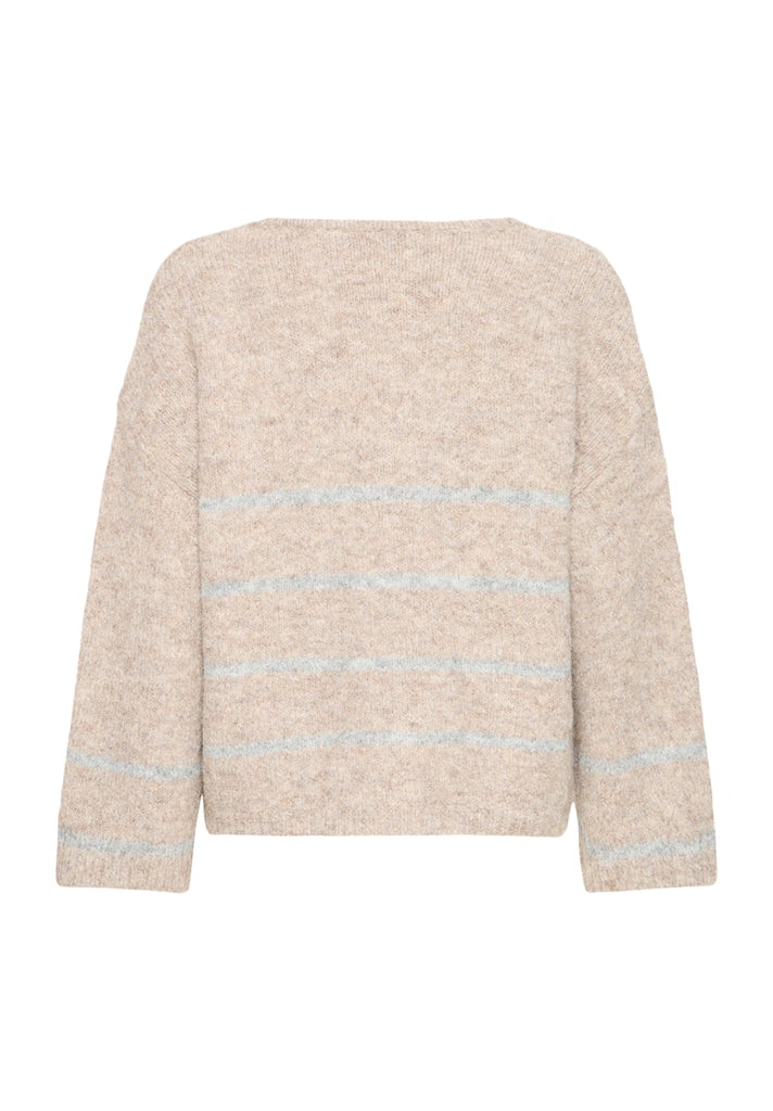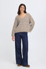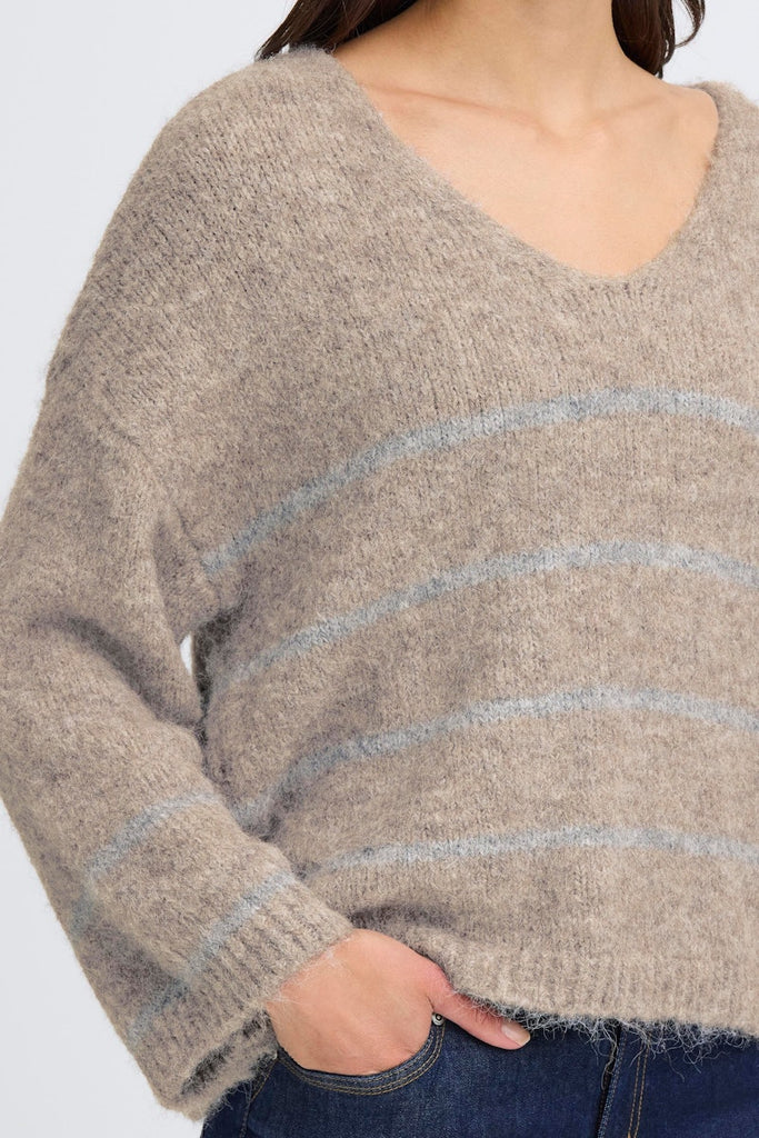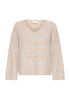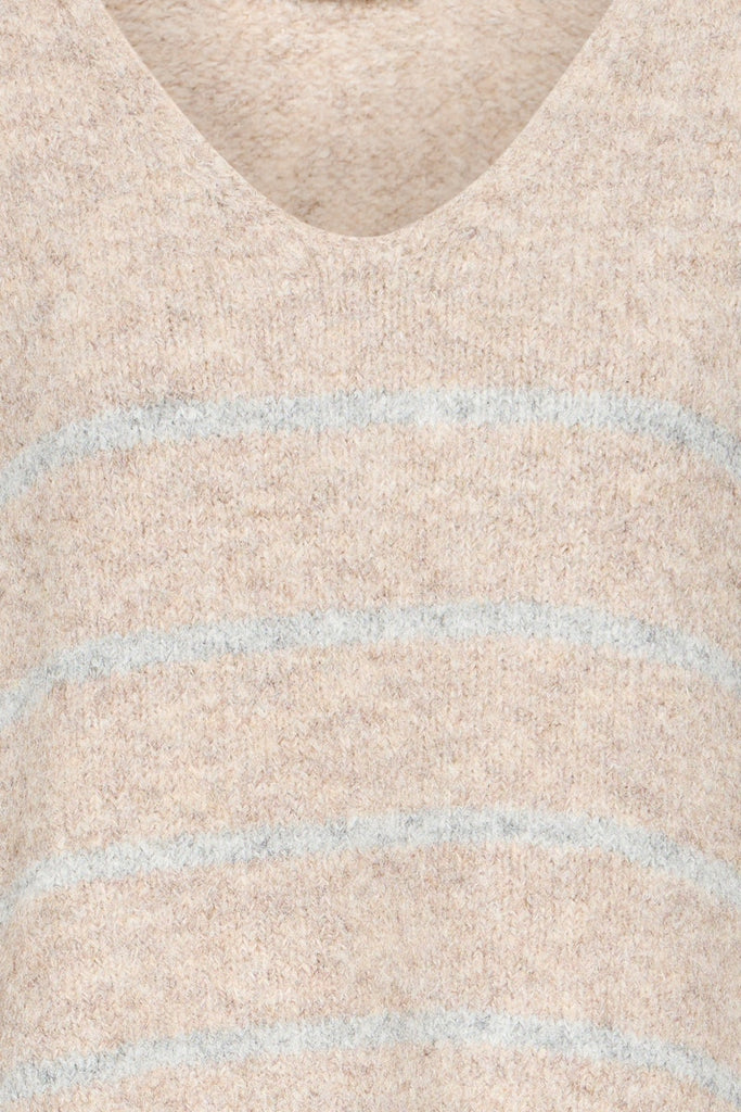 This women's V-neck sweater features a relaxed fit and long sleeves for everyday comfort. Subtle horizontal stripes and a soft knit texture add understated style, making it ideal for versatile, casual wear.