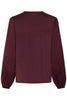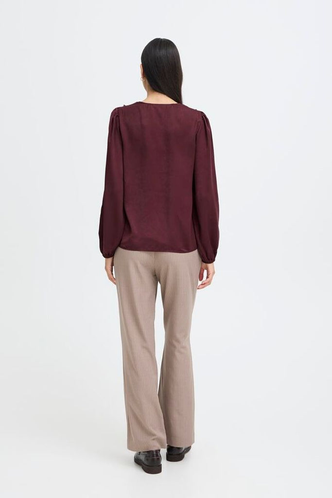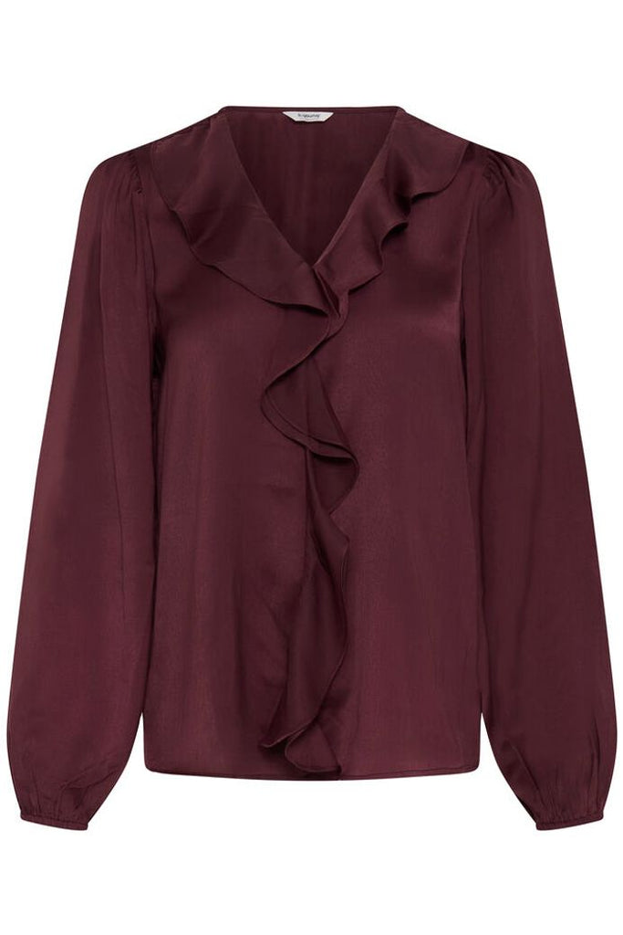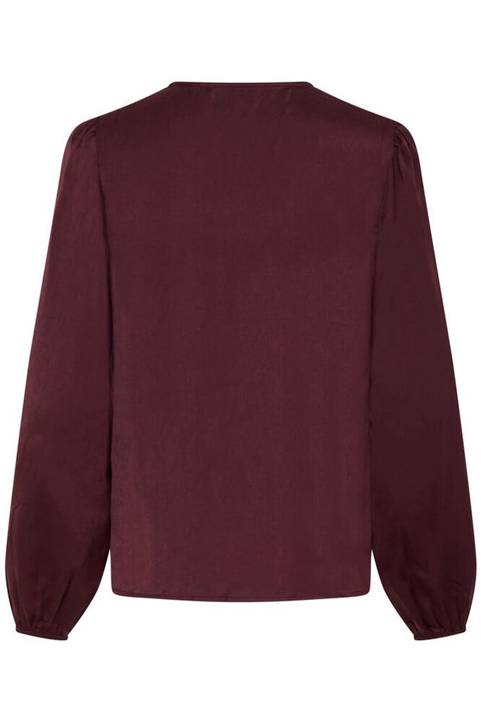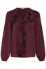 A smart ruffle V neck silky blouse with long sleeves, in a gorgeous port colour.