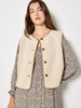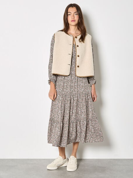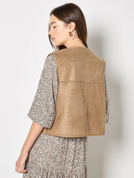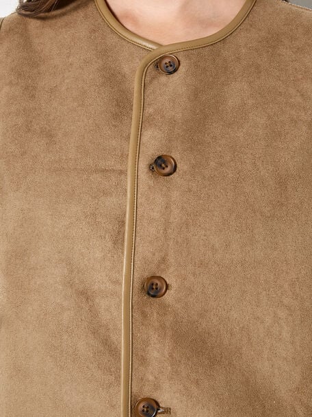 This versatile gilet features a reversible design, allowing you to create two different looks with one piece. Framed by a crew neck and sleeveless styling, this lightweight layer boasts a button-down front, a soft suede side, and a cosy borg side. Layer this reversible gilet over a printed midi dress for a boho-inspired finish that’s perfect for city strolls, shopping trips, and brunch dates with friends.