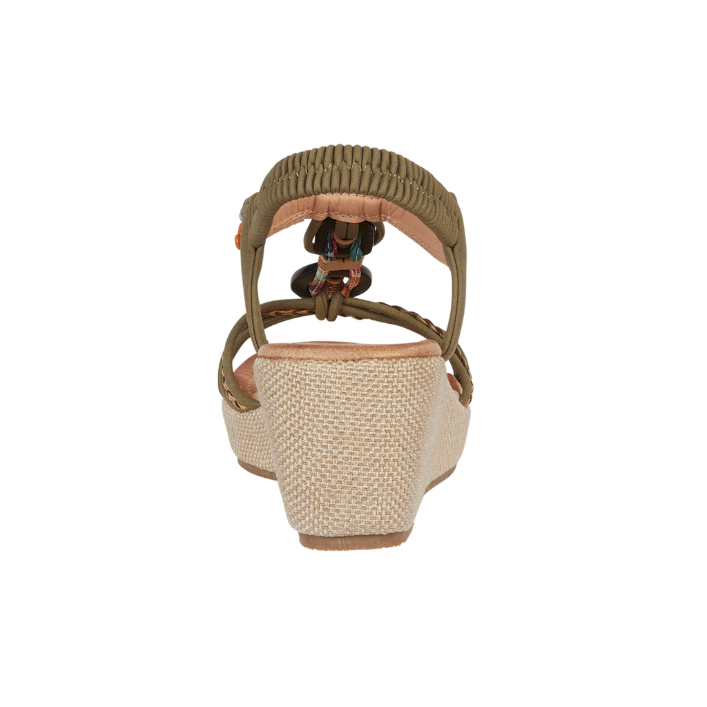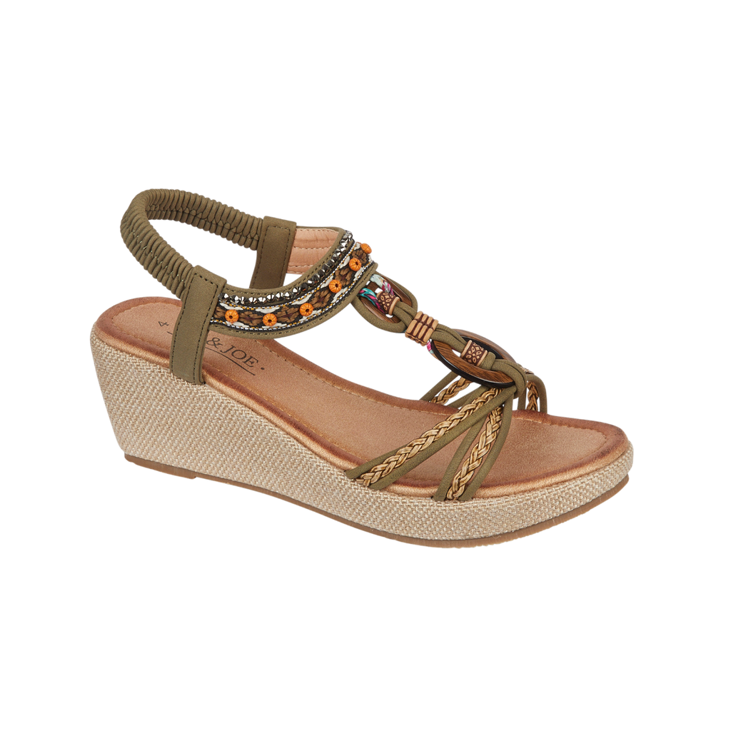 A gorgeous ladies lightweight gladiator style wedge sandal with elasticated back strap and embellished trims.