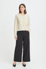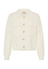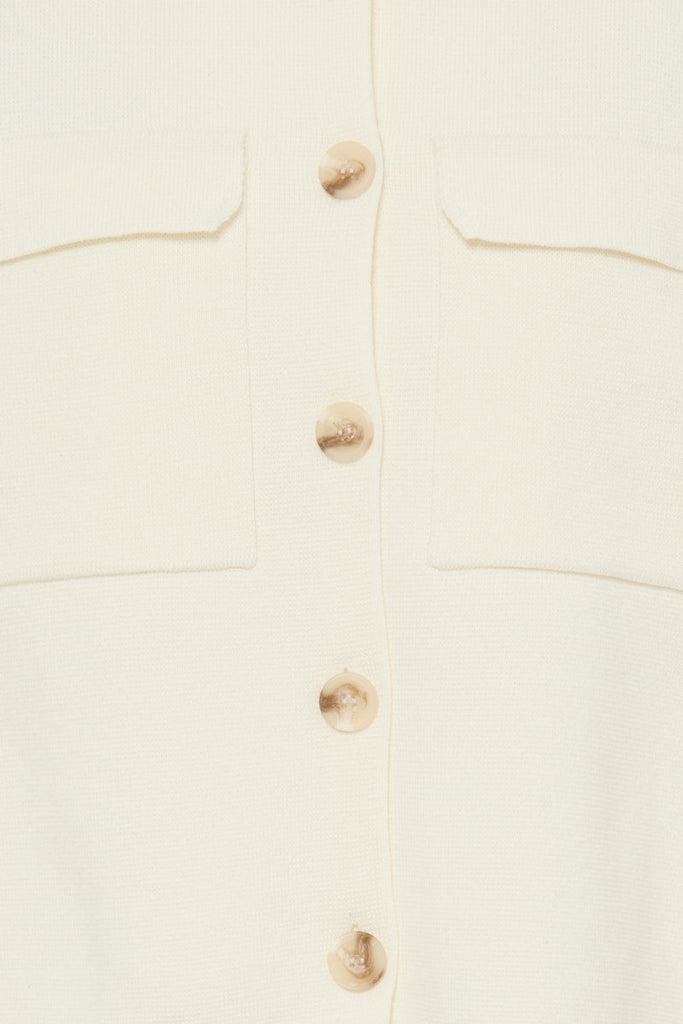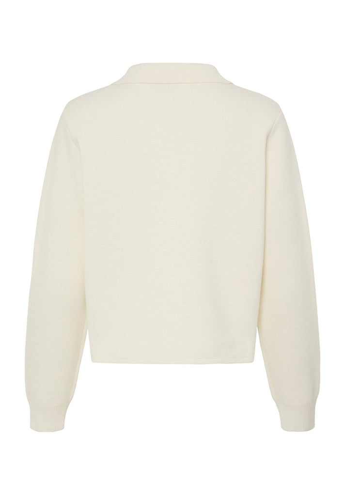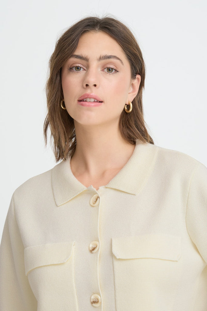 This women's knit jacket features a regular fit, button front, classic collar, and long sleeves. Patch pockets add versatile styling for work or leisure. Comfortable design ensures ease of wear throughout the day.