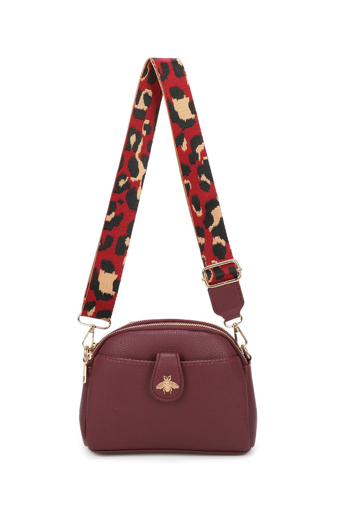 This stylish crossbody bag features a structured silhouette with a textured finish and a playful animal-print strap for added flair. A gold-tone bee embellishment on the front adds a charming, distinctive touch. Perfectly sized for daily essentials, it combines fashion and function for effortless everyday wear.