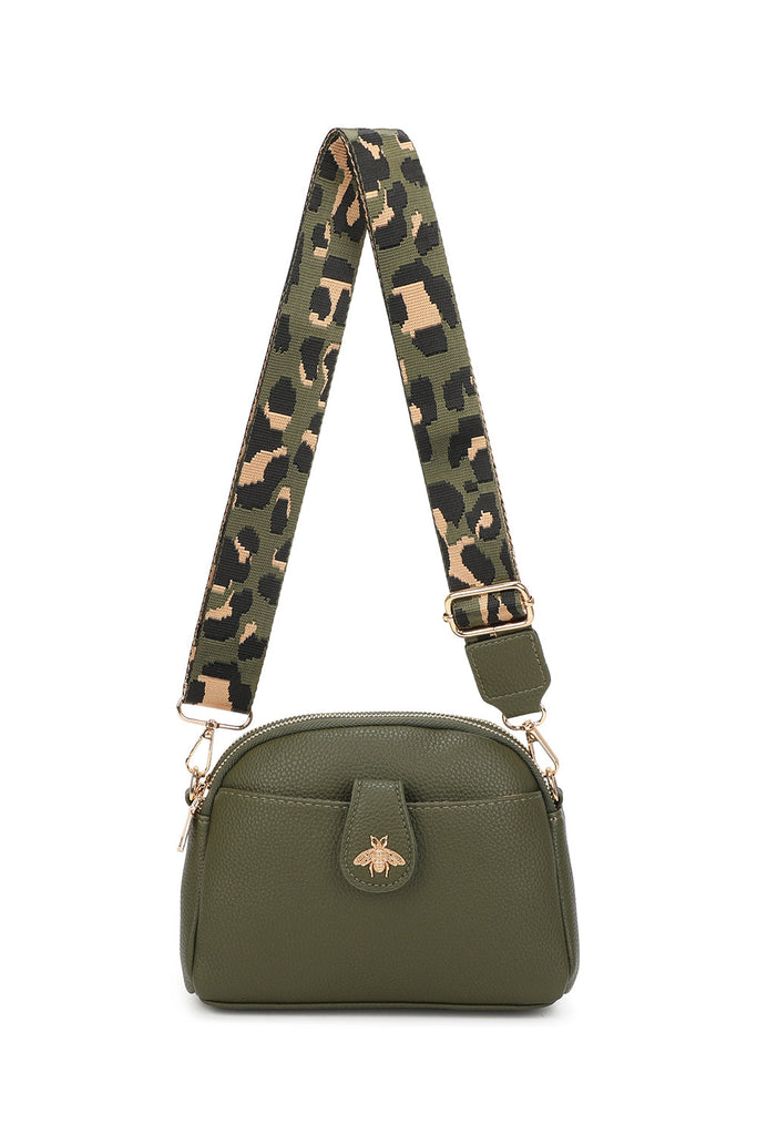 This stylish crossbody bag features a structured silhouette with a textured finish and a playful animal-print strap for added flair. A gold-tone bee embellishment on the front adds a charming, distinctive touch. Perfectly sized for daily essentials, it combines fashion and function for effortless everyday wear.